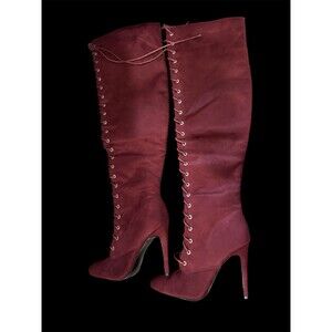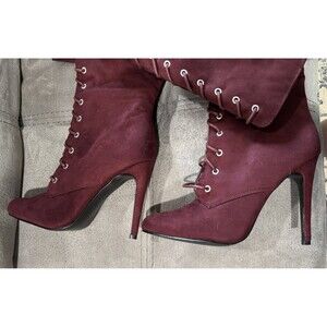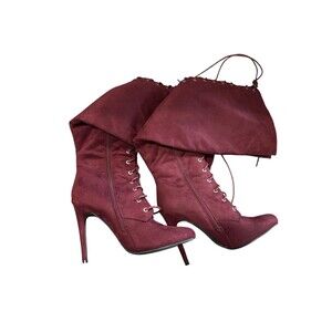 Elevate your footwear collection with these JustFab over-the-knee boots. Designed with a sleek red suede finish, they feature a lace-up closure and stiletto heels, offering both style and support. Ideal for a polished look, these boots can be paired with a variety of outfits for work or a night out.