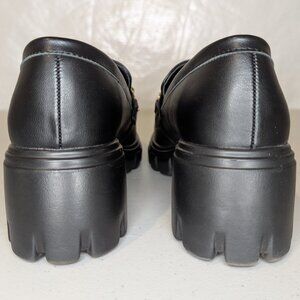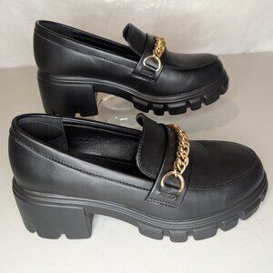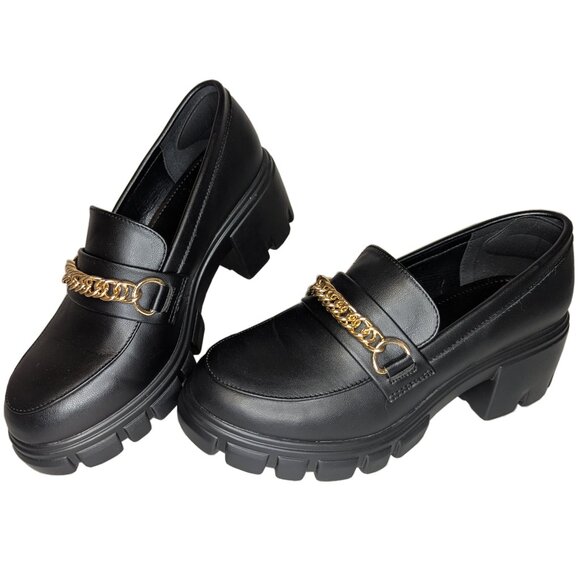 Tags: loafer, slip on, black, chunky, platform, goth, gothic, corporate goth, business witch, office, business casual, work, workwear, professional, comfortable, academia, lug, lugged, block heel, gold, chain, prep, preppy, trend, trendy, boho, city, contemporary