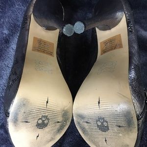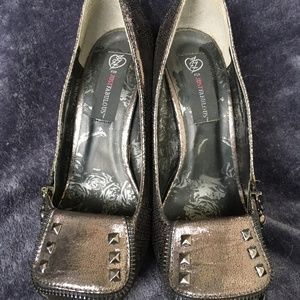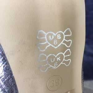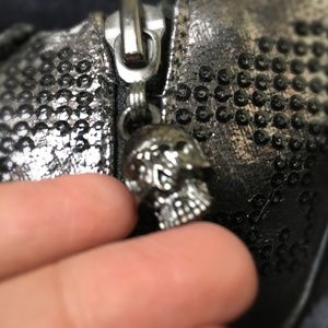 Size 8 Awesome metallic silver faux leather stiletto heels with 1.5 platform. Metal stud, sequin skull, and zipper details. In great previously loved condition, regular wear on the bottoms of the shoes.