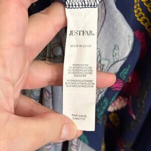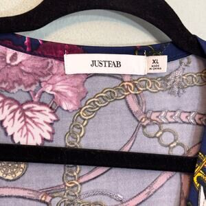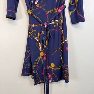 JustFab Mini Wrap Dress XL Blue Multi Chain Floral Tie Waist Surplice Equestrian