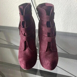 JustFab Niara Burgundy Heeled Boots Size 9. Has a 5.5 inch heel. In great condition with only a little wear on the bottom of the shoe. Suede like material on the outside. Great pair of heeled boots for a night out! Has a zipper on the side of the shoe