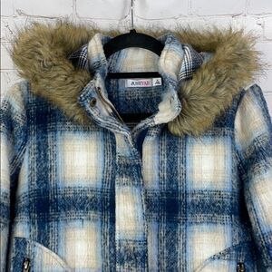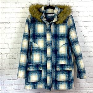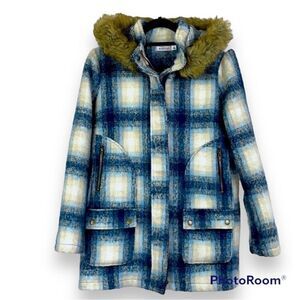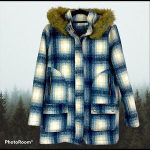 JustFab. Plaid hooded Faux Wool Parka. Blue. Med. Great condition. Detachable hood. Front zipper w/ top and bottom snap closure. 4 exterior front pockets. Unlined. Really cute coat.