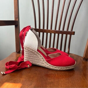 JustFab wedge heels with woven bottom and red fabric upper. Ballet style ties! Super cute Americana style.