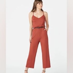 Never Worn. Chic ribbed jumpsuit in a warm rust hue. Ideal for versatile styling. Forgiving slinky fabric reduced wrinkling.