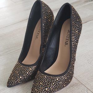 Beautiful Rochella pumps from JustFab: black with gold stud-like gems! Absolutely stunning pumps that I only wore once in the house but never outside: I love them but they are too high for me and sadly I cannot wear them, no matter how much I try... :'-(