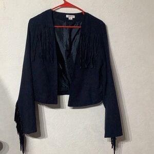 Chic navy jacket with stylish fringe details. Ideal for a trendy look.