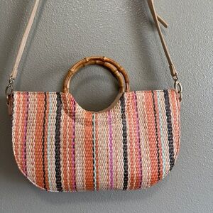 JustFab Wicker Circle Bag with Cane Handle and Boho Colors