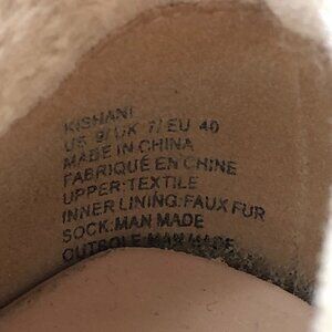 Women's Kishani brown faux suede textile high heel hidden wedge faux fur cuff ankle booties, ankle boots. Side zipper closure, hidden wedge heel, faux fur cuff.