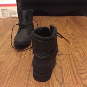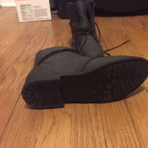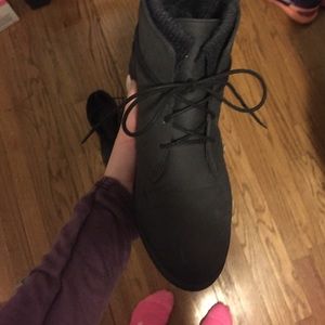 Dark grey soft booties with a sweater-like trim. Has wrap around laces which are super cute! Only been worn twice and are in good condition