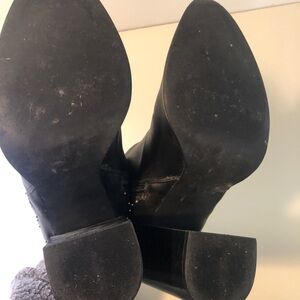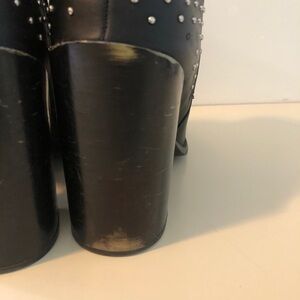 Silver zippers outside, black zippers inside, silver studs, scuffing on back of one heel, small mark on one toe (both in pictures), could be easily fixed with polish, I’m sure!