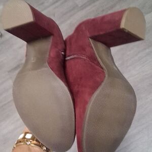 Chic burgundy boots with lace-up detail. Stylish block heel. Perfect for any outfit.