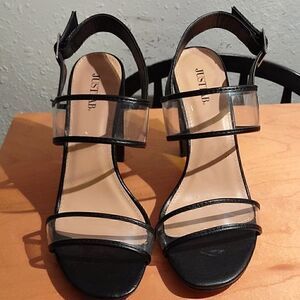 These NEW without tags Just Fab Clearly the One 4.5" heeled sandal are a size 8.5. Clear straps with black trim and black heel. All offers welcome.