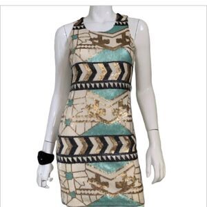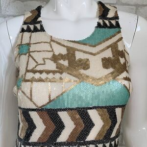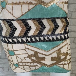 Perfect for upcoming parties! Dress up or dress down with a moto jacket and booties. Front is an Aztec print in beautiful aqua, gold and black sequins. Back is a cream color stretchy bodycon, racer back style with a gold zipper.