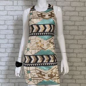 Just Me Aztec print aqua/gold/black sequin bodycon dress.