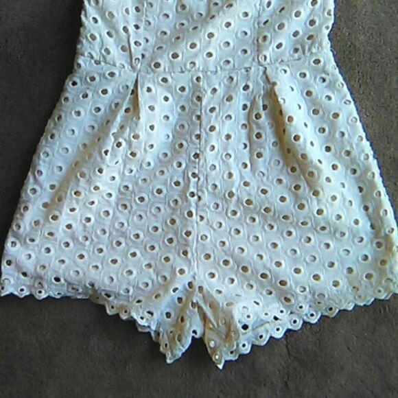 Super cute romper. Soft creamy white. Wider straps. Princess seams on bodice. V back. Back zip. Pleats in front and back. Legs have zig zag bottom. Fully lined. Size S measures 35 at chest, 28 at waist, 40 at hips, 13 inch rise. Perfect for warm weather fun.