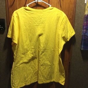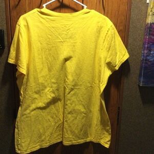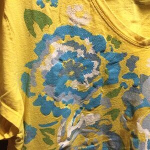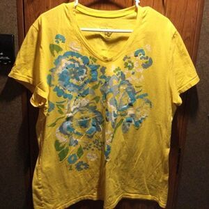 EUC. Just My Size brand women’s size 2X short sleeve tee with teal graphic on front of abstract floral with just a touch of glitter. Teal and green print on yellow background. Showing photos of front and back sides.