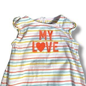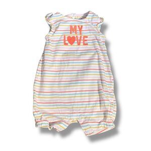 • Striped Romper With “My Love” Applique Ruffle Trim And Snap Button Bottom