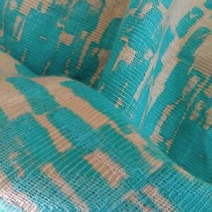 So many interesting details. Brocade like fabric, printed with bright turquoise blue abstract graphics. Sculptural seams on bodice. Wide waistband. Seams around hips. Fully lined. The back zip goes the full length of the dress. The top has a layer, and openings. Size 6 measures 36 at chest, 30 at waist, 39 at hips, 36 long from shoulder to hem. This is a beauty!
