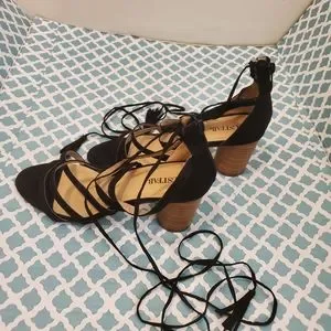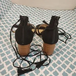 A faux stacked cone heel sandal with a lace up tassel tie closure.
