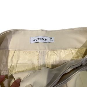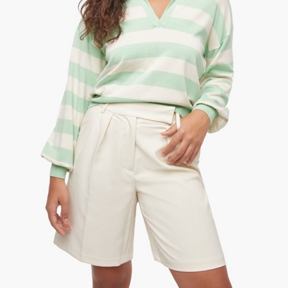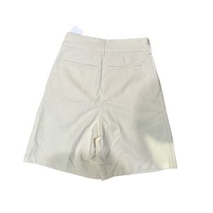 White shorts. Loose fit. Pleated design. Side & back pockets. Zipper / hook & eye closure. Fabric type: 95% Polyester, 5% Spandex. New. Has marks but can be washed off.