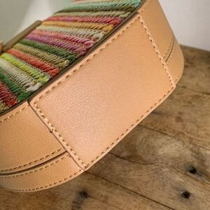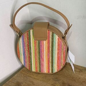 Justfab colorful woven round handbag. Fold over clip closure, inside slip pocket, new never used. Bright and a cute unique look.