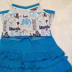 Blue ruffle skirt, with t-strap too to match, attached short.