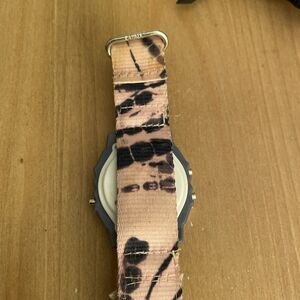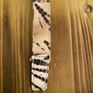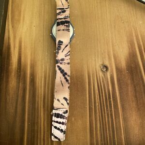 Largest wrist size is 6 and a half inches, tie dye style pink and blue band. Very cute for a woman or girl. New battery installed