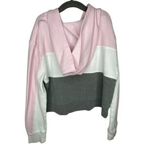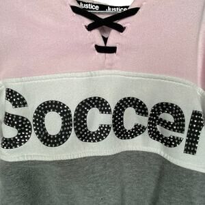 Pink, white, and gray v neck lace up hoodie with Soccer written across the front with silver tone studs.