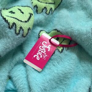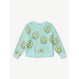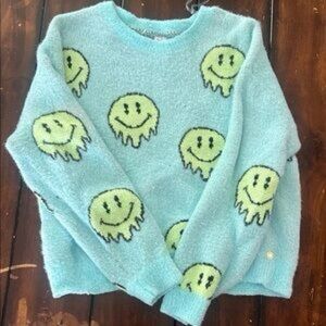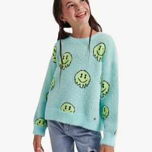 Add joy to your child's outfit with this aqua sweater. Features playful smiley faces for a cheerful look.