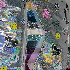 Two zip compartments, two side pouches, and one front pocket for the wristlet.