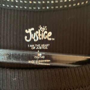 Stylish black ribbed tee by Justice. Features short sleeves and lace hem. Ideal for everyday wear.