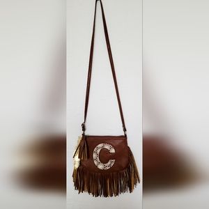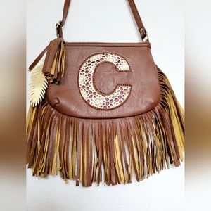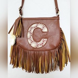 Justice women's boho fringe faux leather crossbody bag with letter/ monogram "C"