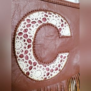 Justice Boho Fringe Faux Leather Crossbody Bag Letter "C" Monogram Brown