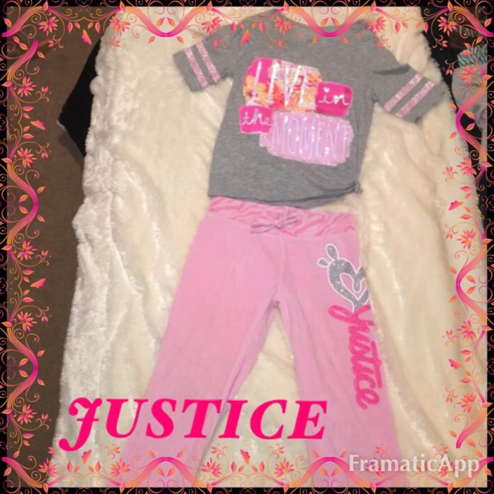 Pink sweatpants with "Justice" and sparkly heart down left leg. Grey "Live in the moment" tee written in sequins with sparkles. So adorable. All items are size 10.