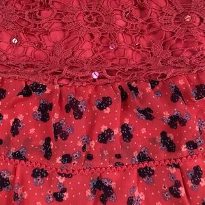 Justice Floral Ruffle top has coral lace on the top of shirt and three ruffles at the bottom with little flowers all over each ruffle and on back of shirt. Flowers are navy and blue. The shirt ties in the back.