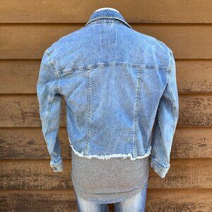 This stretch denim jacket offers a modern, casual look with its frayed hem and light blue wash. Designed for comfort and style, it features functional buttons and a versatile fit.