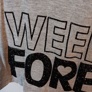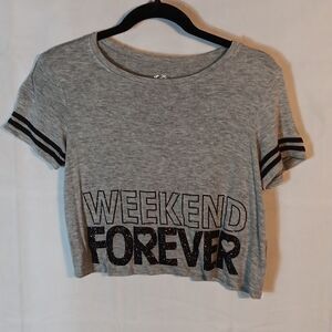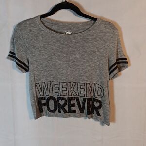 This gray short sleeve ,cropped crew neck Justice glitter "Weekend Forever" Tee is a girl's size 10 with a pit to pit measuring 18" and a length of 17.5". In excellent condition.