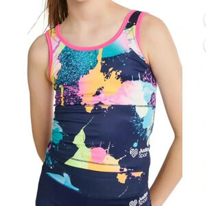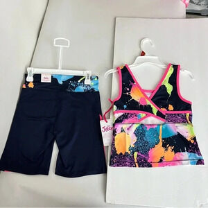 New, Justice Girls J-Sport Longline & Bike Short Active Outfit Set Size Medium (10) color French Navy/Pink multicolor almost black, tie-dye.