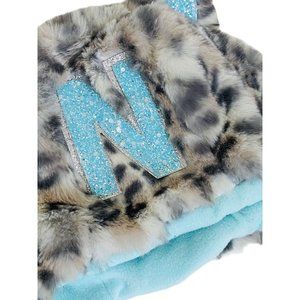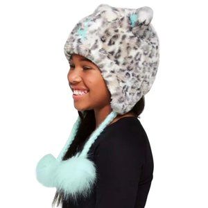 Justice Girl’s Letter N One Size Cheetah Cat Earflap Hat Faux Fur Grey Teal Blue