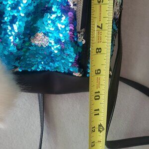 Justice Girls Mini Backpack Blue Purple Silver Color Change Sequin White Pom