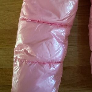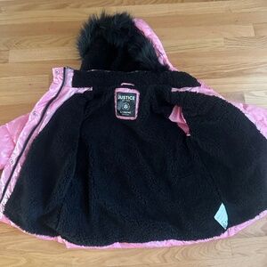 Justice Girls Pink Black Puffer Coat Size Large 12/14. Girl's Bubble Gum/Barbie pink puffer coat; color is accurate in pics 2, 4 and 5. Sparkly glitter flecks shimmer in the pink color. Front zipper with a snap flap to cover zipper. Soft black fleece lines the hood, pockets and coat. Attached hood with a snap on/off faux black fur trim (pic 10.) This is a warm coat; great for everyday wear or for the ski/snowboard slopes. Size Large 12/14. Excellent, clean condition. Looks new.