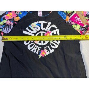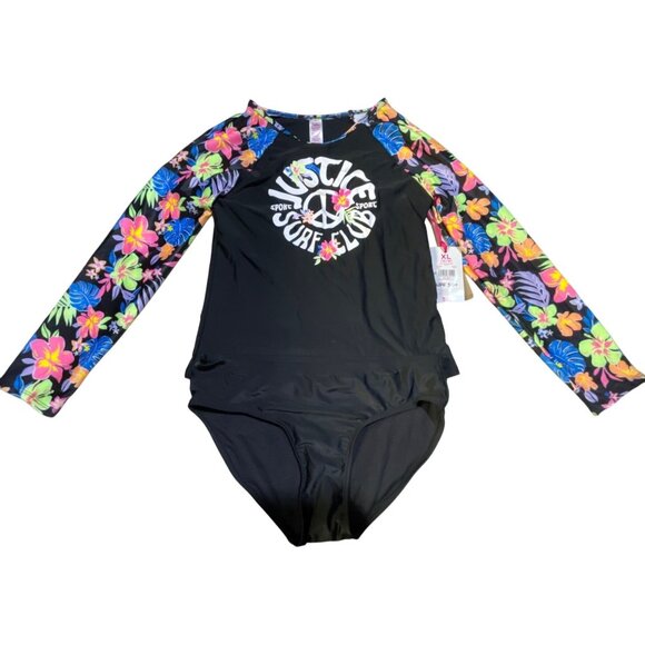 This Justice 2 piece Rashguard swimsuit features a vibrant floral sleeve design and a stylish Surf Club logo, providing both fashion and comfort. The long sleeves offer added protection for extended outdoor activities. Suitable for swimming and beach outings, this swimsuit is crafted with attention to detail and quality materials to ensure durability.