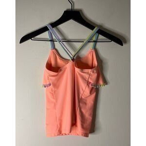 Strappy back tankini top from Justice. Peach color with multicolor straps and trim. Size 12. Gently preowned condition with no tears or stains.