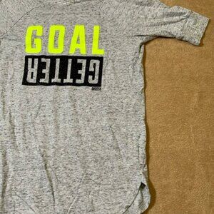 Inspire your young athlete with this empowering Justice Girls Size 14 top, designed to blend comfort and style with a positive message. This heather gray half-sleeve T-shirt stands out with its bold neon yellow and black 'GOAL GETTER' graphic, making a vibrant statement with every wear. Crafted from soft and breathable fabric, it's perfect for both active days and casual wear. Its rounded hem provides extra coverage, making it suitable to pair with any bottoms for a versatile look. Ideal for the goal-oriented girl who loves to make a statement while being on-trend and comfortable.