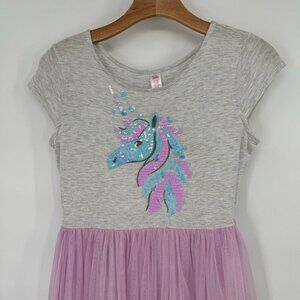 Adorable unicorn sequin dress with short sleeves. Soft grey top with a pink tulle skirt. Perfect for young unicorn enthusiasts.