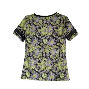 When super cute style meets athletic sensibility. I'm imagining Sporty Spice as a tween. Jersey fabric has neon green daisy allover print with black details. Words on front are in white with shimmery overlay.