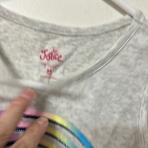 This chic tank top from Justice showcases a striking graphic design on a soft gray fabric, perfect for adding a touch of flair to your wardrobe. Its sleeveless design ensures comfort and style, making it an ideal choice for warm days or layering.