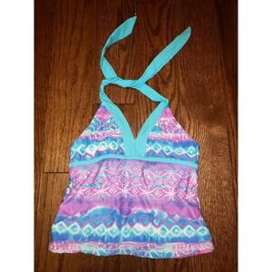 Adorable Swim Halter top by Justice. In good condition, no pilling or damage. Aqua blue and purple print make this perfect to pair with your favorite swim bottoms.