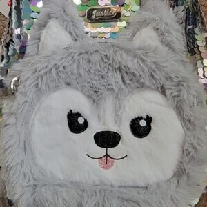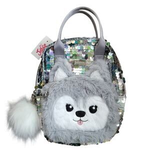 Justice Husky Mini Backpack Silver Sequin Plush Pom Pom Double Handle Gift Dog