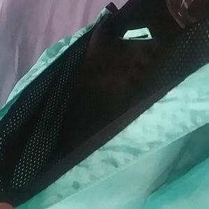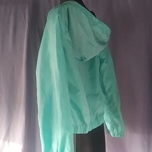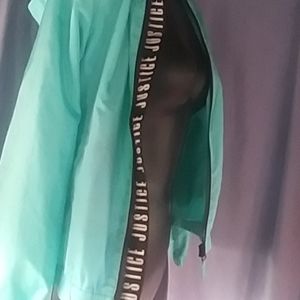 Super super cute light green windbreaker jacket sz 10 words Justice down right zipper side in black with white letters. Pockets for hands on both sides. Attached hood.